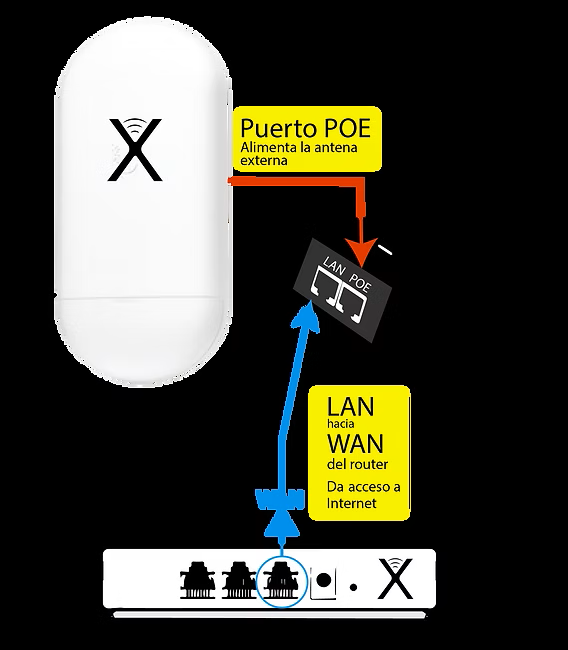 4.- Checar si el led wan esta encendido, si no checar que el cable que va del poe al router este en el puerto rojo
